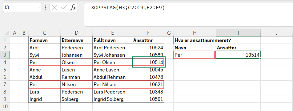 Hvis vi bruker samme formel, men leter etter Per, ser vi at vi kun får første resultat. Dette er uheldig, så vi burde bytte over til å søke etter noe unikt ved å heller da bruke fullt navn.