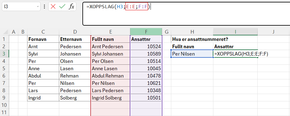 I dette eksemplet ønsker vi å finne ansattnummeret til Lars. Søkeverdien vår er celle H3 som kun inneholder navnet Lars, søkematrisen vår er C2:C9 hvor vi kan finne Lars og returmatrisen vår er F2:F9 hvor Lars sitt ansattnummer finnes.