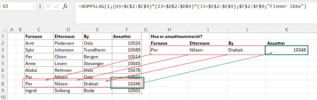 Det hender i blant at vi trenger å søke etter flere kriterier samtidig. I dette tilfellet ser vi for oss at vi har to personer som begge heter Per Nilsen (rad 7 og 8), så det eneste vi har å skille dem på annet enn ansattnr er byen de bor i. Da kan vi bruke flere kriterier på denne måten. Vi bruker fremdeles XOPPSLAG, men de forskjellige variablene får litt annen betydning, og vi legger til et svar hvis formelen ikke finner en verdi som matcher alt:
